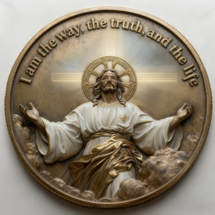The obverse features a powerful religious motif. At the center stands a depiction of Jesus, with outstretched arms, symbolizing love, salvation, and guidance. Clad in a white robe with golden accents, his serene presence conveys peace, hope, and spiritual guardianship. Behind him, a radiant cross and subtle light rays evoke divine presence and enlightenment. Encircling the design is the inscription "I am the way, the truth, and the life" – a timeless biblical declaration that anchors the coin’s spiritual significance.